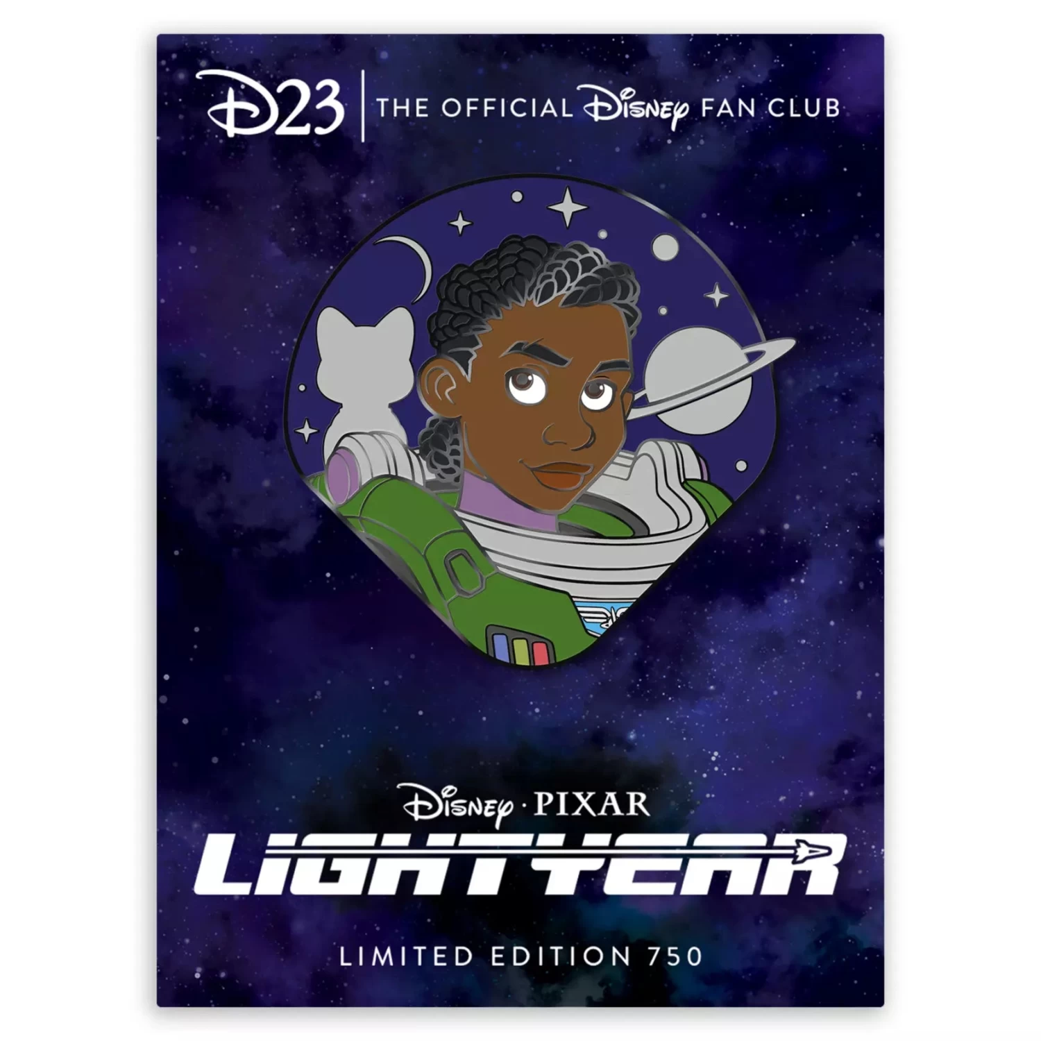 Launch into infinity and beyond with this stellar D23 Gold Member-exclusive pin inspired by Disney and Pixar’s Lightyear. This limited edition keepsake celebrates the bravery and empowerment of Commander Alisha Hawthorne. The design features Alisha in her Space Ranger utility suit, along with cosmic elements and a silhouette of the feline robot companion: Sox the cat. Gear-up for your next adventure to the stars with this collectible cloisonné pin.