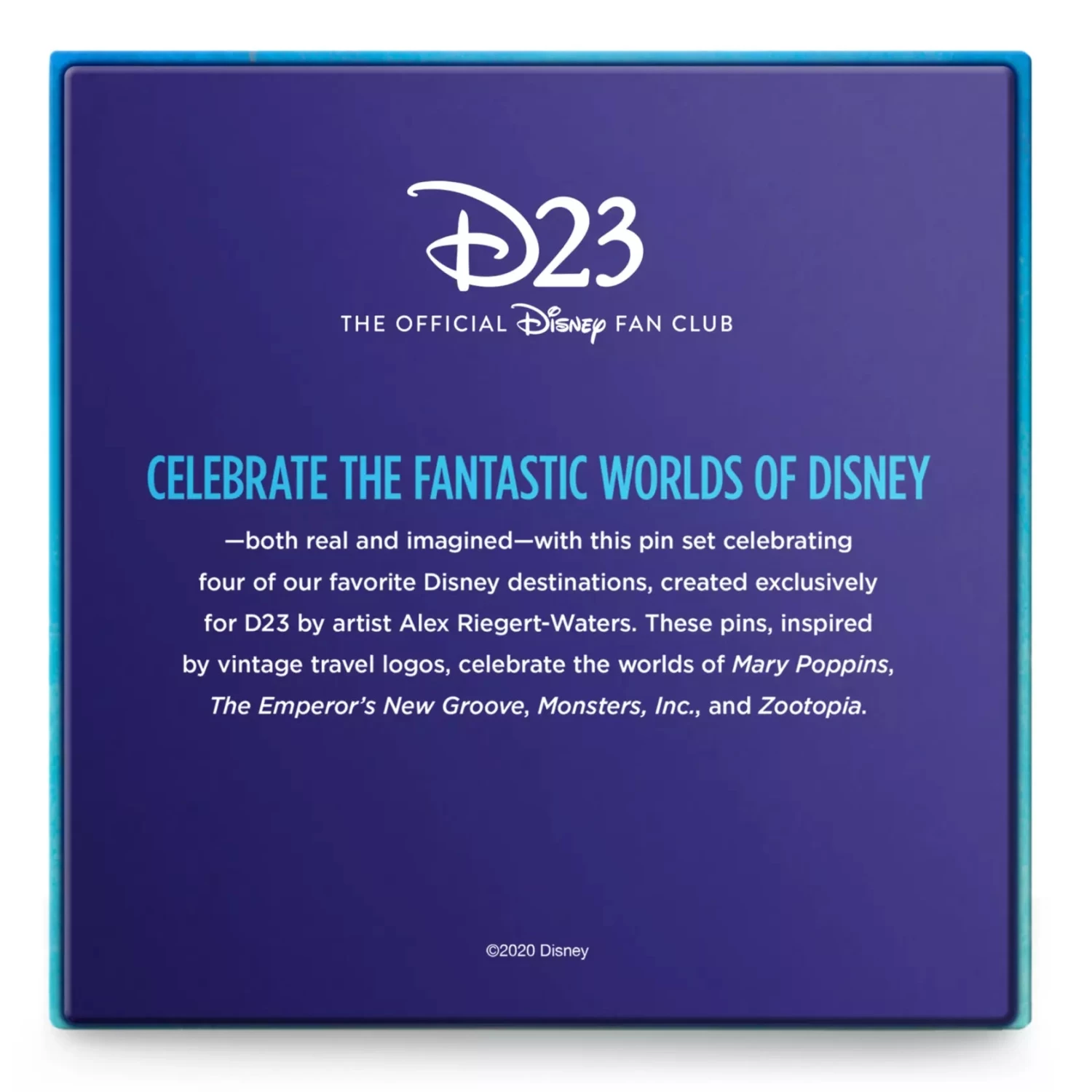 Celebrate the fantastic worlds of Disney – both real and imagined – with this set of four pins depicting favorite Disney destinations. Created exclusively for D23 by artist Alex Riegert-Waters, these collector’s keepsakes are inspired by vintage travel logos.