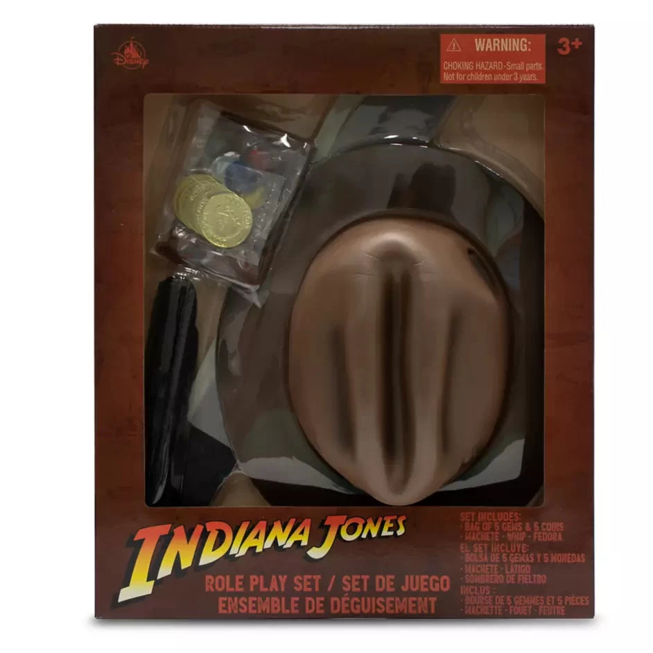 - Set includes bag with five gems and five coins, play machete, play whip and fedora hat
