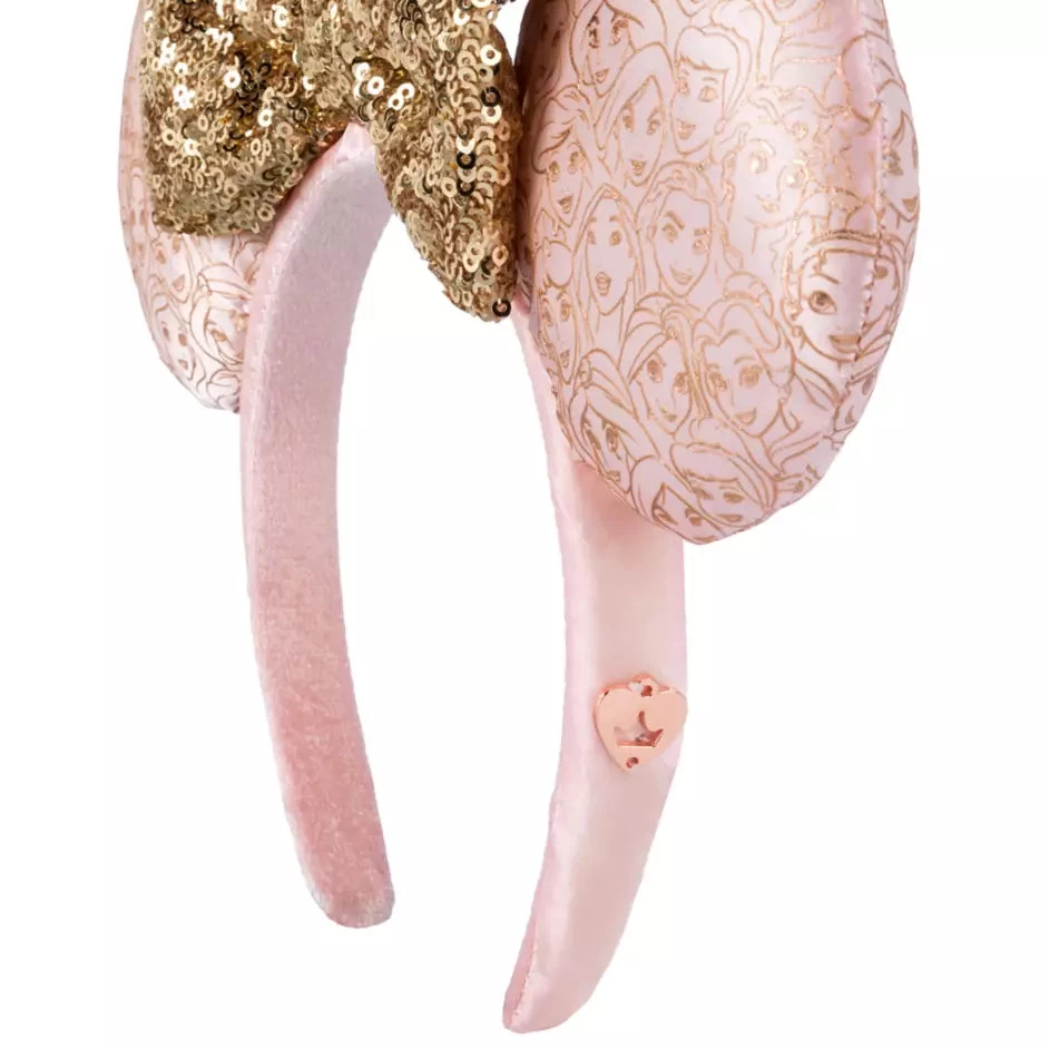 Dreams dare to come true when wearing this Minnie Mouse ear headband crowned by a golden sequined bow. The satin, padded ears enchant passers-by with a collage of pretty Disney Princesses printed in golden ink.