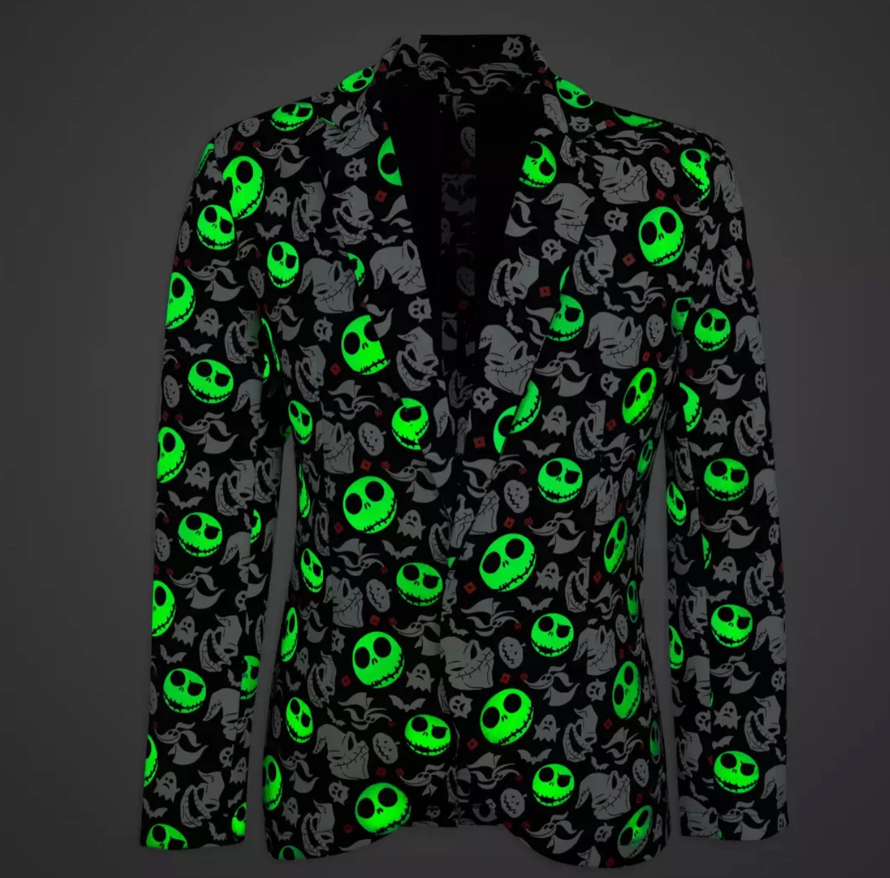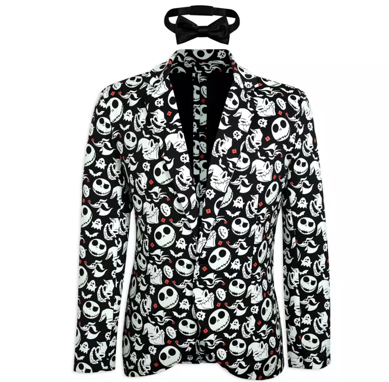 Halloween festivities always inspire a certain glow, but even more so when you slip into our stylish half-suit costume ensemble pairing glow-in-the-dark Jack Skellington, Oogie Boogie and Zero-patterned jacket with twinkling light-up bowtie. Magic in the details Authentic Disney Costume* Includes jacket and bowtie Formal jacket features allover print pattern inspired by Tim Burton’s The Nightmare Before Christmas including Jack, Oogie Boogie and Zero Pattern on jacket glows in the dark Structured shoulders, lapel and collar Button font Light-up satin bow tie with twinkling multicolor LED On/Off switch and battery pack Self-stick fabric closure tie * Please note: Jacket and tie only. Does not include shirt, pants, socks, shoes, gloves, or mask. The bare necessities Requires 2 x CR2032 lithium button cell batteries, included Jacket: 96% polyester / 4% elastane Bow tie: Polyester / electronics Imported